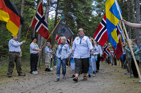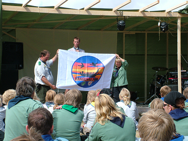 Leirsjef Lars N. Hjertås fra Tjøme åpner leiren og presenterer det flott leirflagget. Foto Elisabeth Jacobsen