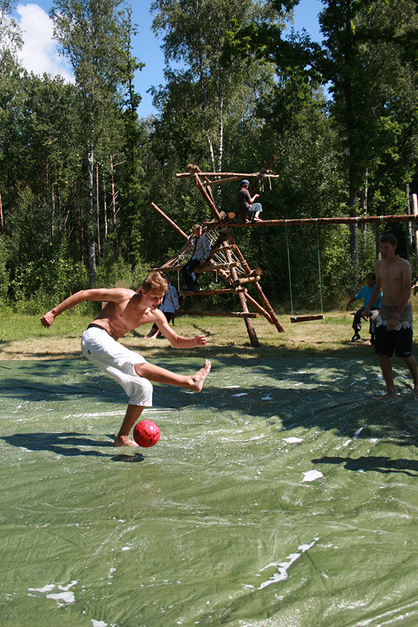 Tallak Bergeim fra tønsberg speidergruppe i spilte fotball på såppeglatt underlag på markedsdagen. Foto Tina Malen Hansen